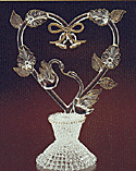 31456 A perfect crown for your wedding cake. Two kissing swans amid trailing vines with golden accents. 6 3/4" x 3 1/2" x 8 3/4 " high. $27.95 |
